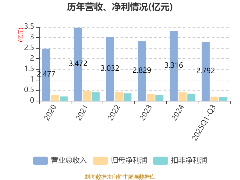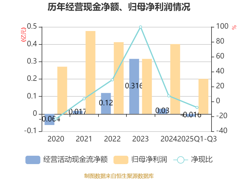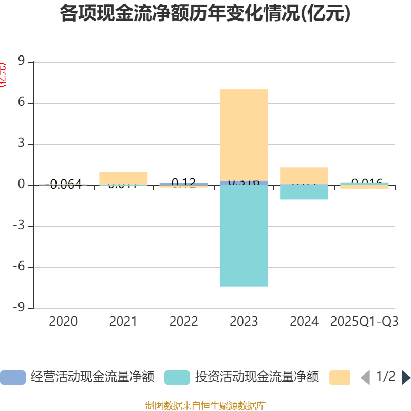 2025年前三季度,公司经营活动现金流净额为-161.12万元,同比减少638.27万元;筹资活动现金流净额-2409.24万元,同比减少538.75万元;投资活动现金流净额1599.29万元,上年同期为416.96万元。