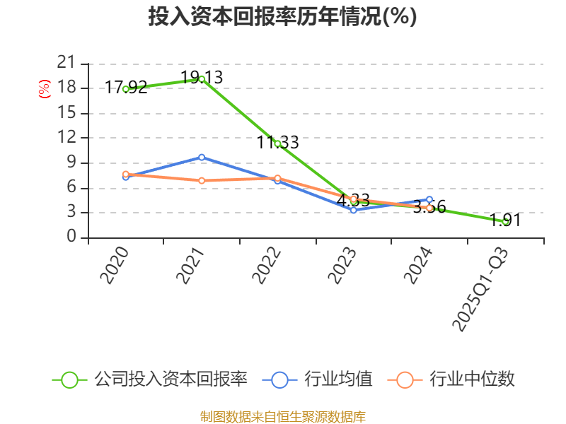 盈利能力方面, 2025年前三季度公司加权平均净资产收益率为1.92%,同比下降1.42个百分点。公司2025年前三季度投入资本回报率为1.91%,较上年同期下降1.38个百分点。