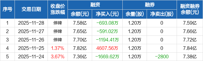 融资方面,当日融资买入0元,融资偿还693.08万元,融资净偿还693.08万元,连续3日净偿还累计2478.51万元。融券方面,融券卖出0股,融券偿还0股,融券余量1.2万股,融券余额177.93万元。融资融券余额合计7.59亿元。