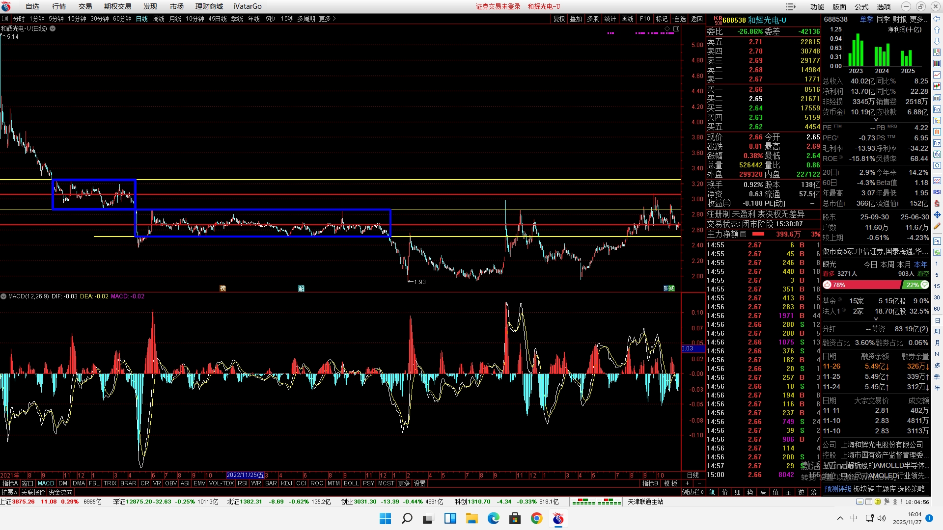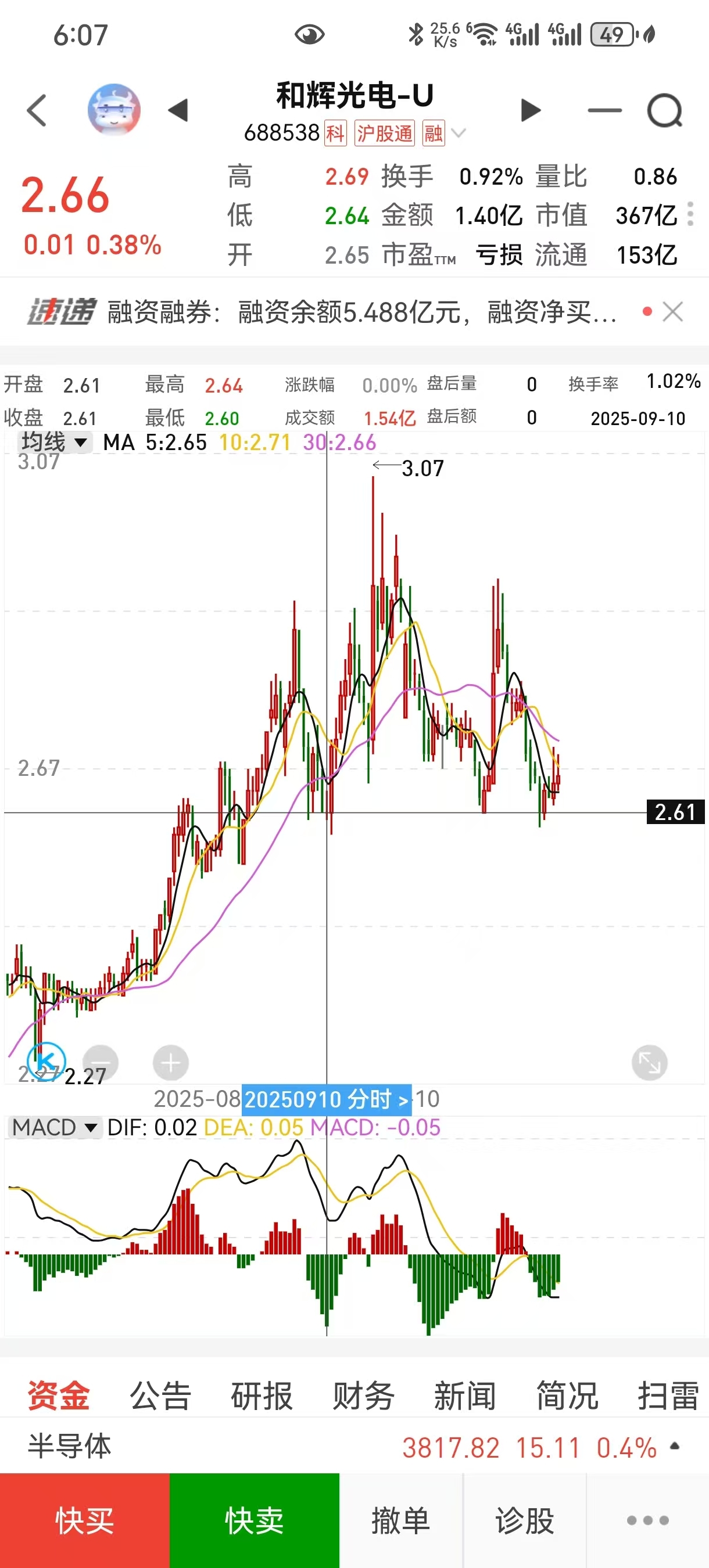 $和辉光电-U(SH688538)$ 图1,日线级别的2次底背离。图2,主力是对前方筹码密集区下探测试强支撑,2.66为该筹码密集区中轴,上行趋势不可逆,安心持股,静待花开吧。。。