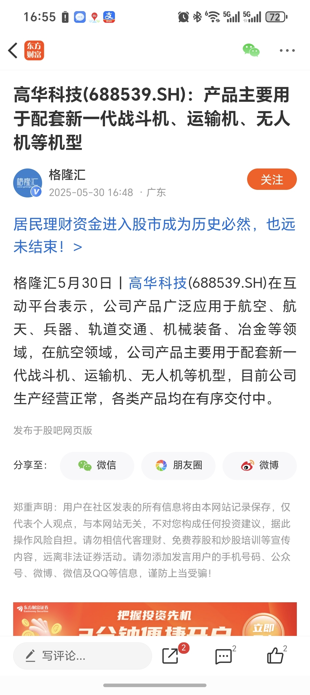 $高华科技(SH688539)$ 高华科技(688539.SH)在互动平台表示,公司产品广泛应用于航空、航天、兵器、轨道交通、机械装备、冶金等领域,在航空领域,公司产品主要用于配套新一代战斗机、运输机、无人机等机型,目前公司生产经营正常,各类产品均在有序交付中。