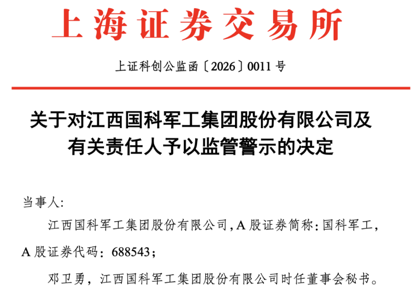 2月2日,上交所在《关于对江西国科军工集团股份有限公司及有关责任人予以监管警示的决定》指出,国科军工回复投资者提问的内容未能准确反映公司在商业航天领域的业务发展、产品定型、经营业绩等情况,也未就研发不确定性等情况充分提示风险,信息披露不准确、不完整,风险提示不充分。