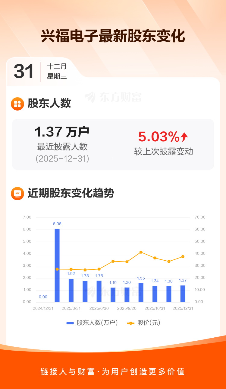 兴福电子:截至12月31日最新股东户数1.37万户,较上期增加5.03%