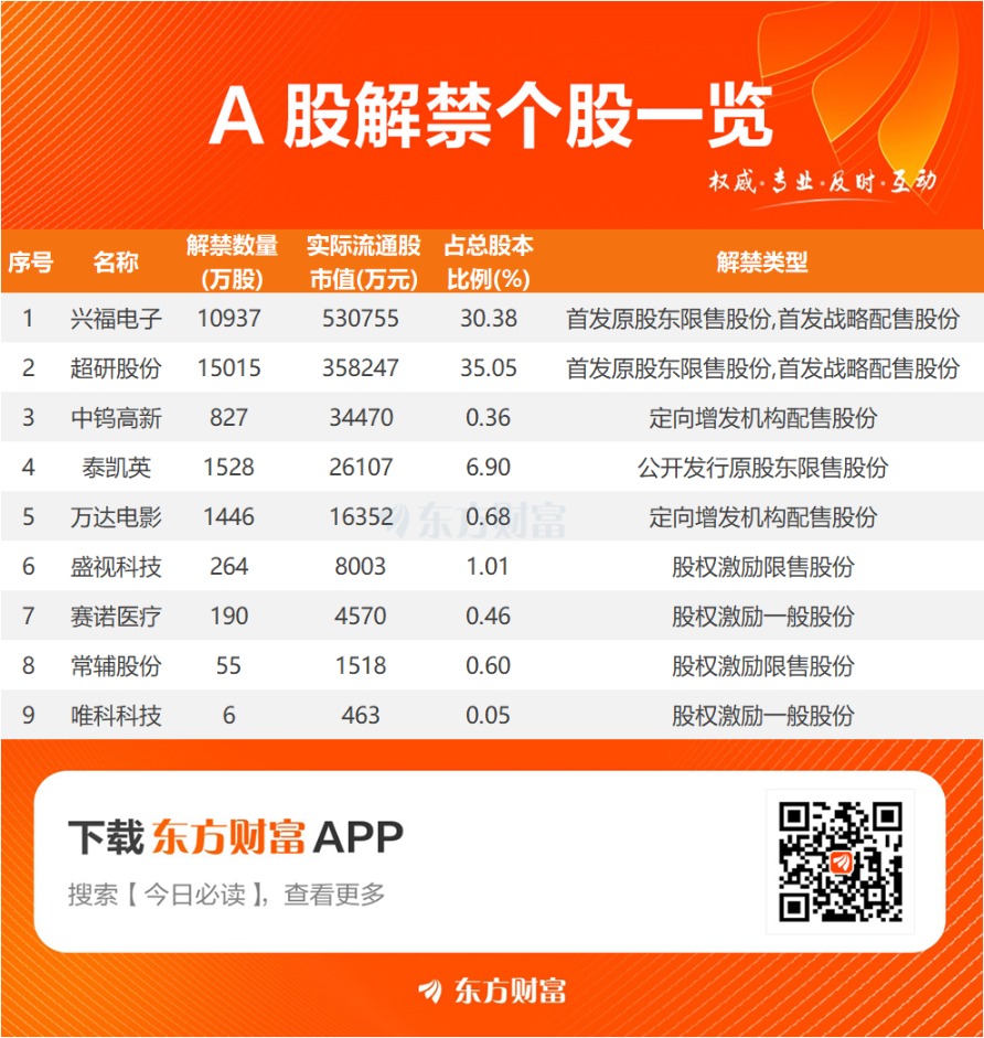 【明日解禁】明日9股解禁 兴福电子、超研股份解禁市值居前