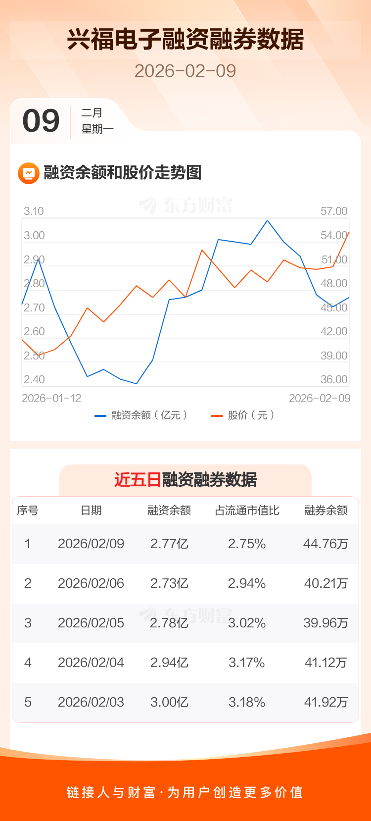 交易所最新数据显示,兴福电子于2026年2月9日获融资买入5597.01万元,融资偿还5118.26万元,当日融资净买入478.75万元。目前,该股融资余额2.77亿,占流通市值比例为2.75%。