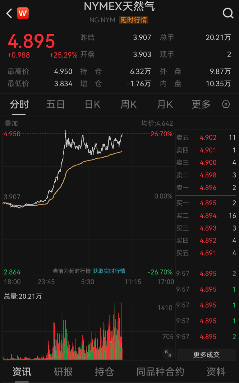 $广钢气体(SH688548)$ 格隆汇1月21日|美国天然气期货日内暴涨27.00%,现报4.962美元/百万英热。