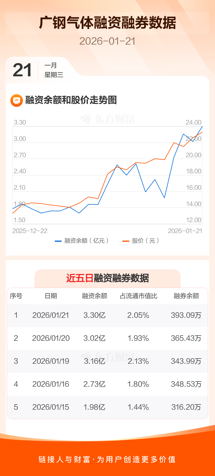 交易所最新数据显示,广钢气体于2026年1月21日获融资买入9371.81万元,融资偿还6517.55万元,当日融资净买入2854.26万元。目前,该股融资余额3.30亿,占流通市值比例为2.05%。