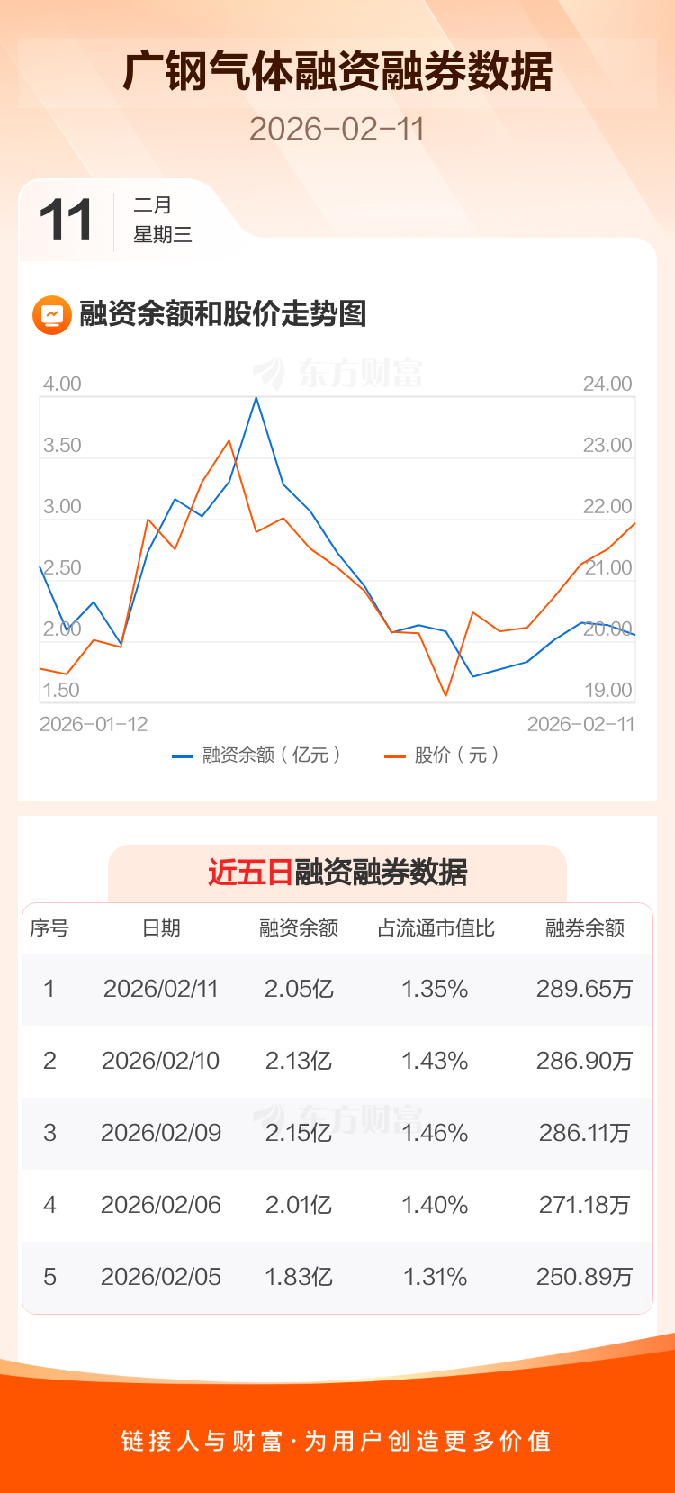 交易所最新数据显示,广钢气体于2026年2月11日获融资买入2090.78万元,融资偿还2916.58万元,当日融资净偿还825.8万元。目前,该股融资余额2.05亿,占流通市值比例为1.35%。