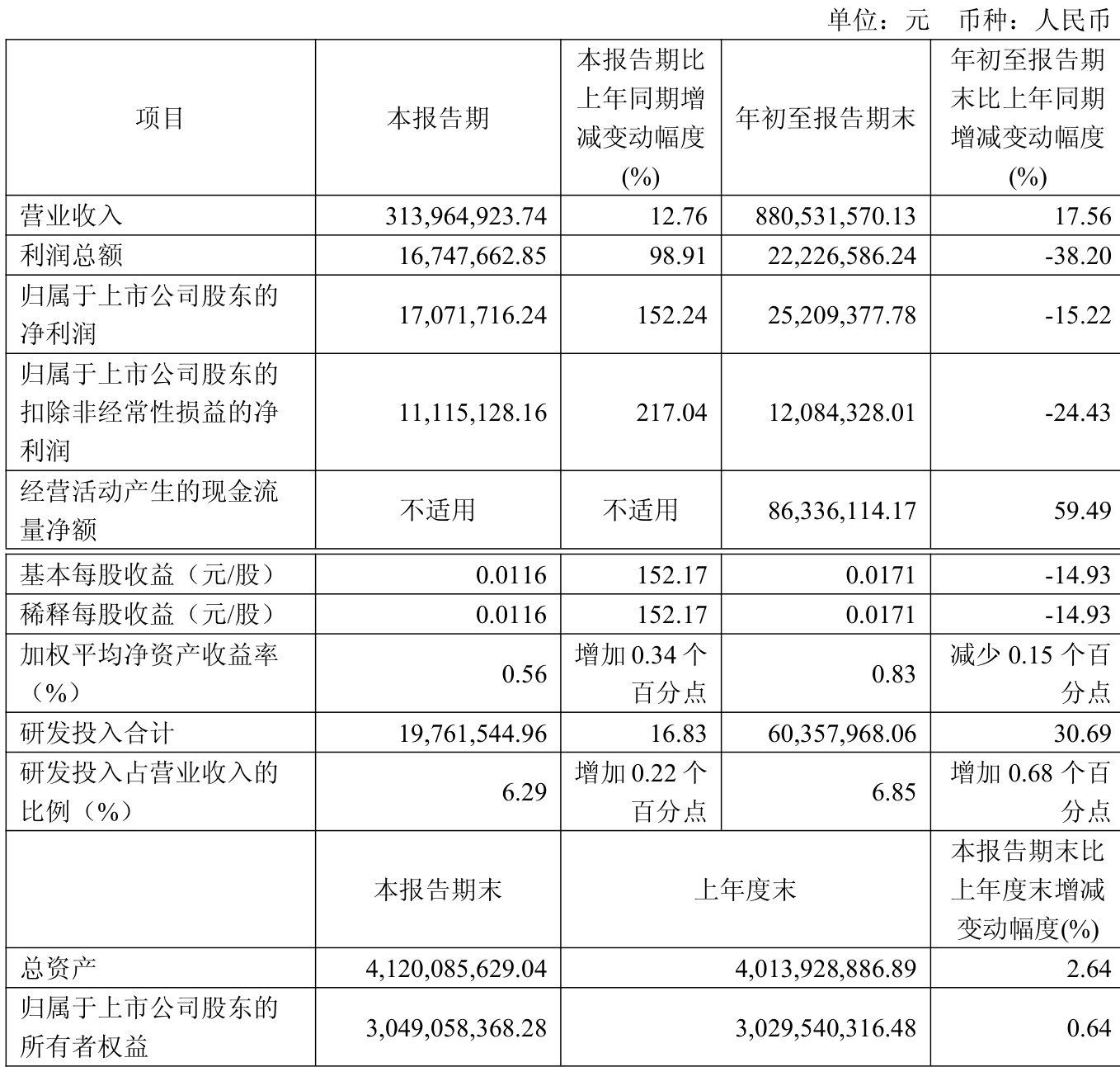 中证智能财讯中巨芯(688549)10月23日披露2025年第三季度报告。前三季度公司实现营业总收入8.81亿元,同比增长17.56%;归母净利润2520.94万元,同比下降15.22%;扣非净利润1208.43万元,同比下降24.43%;经营活动产生的现金流量净额为8633.61万元,同比增长59.49%;报告期内,中巨芯基本每股收益为0.0171元,加权平均净资产收益率为0.83%。