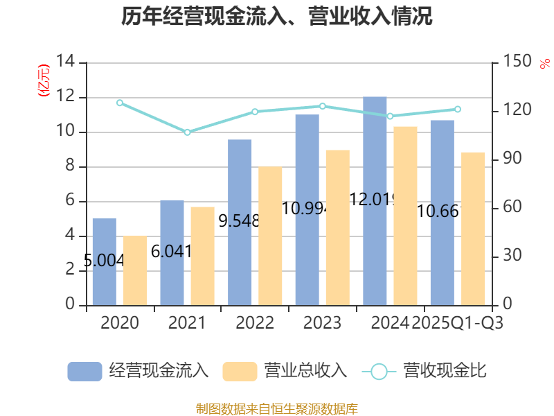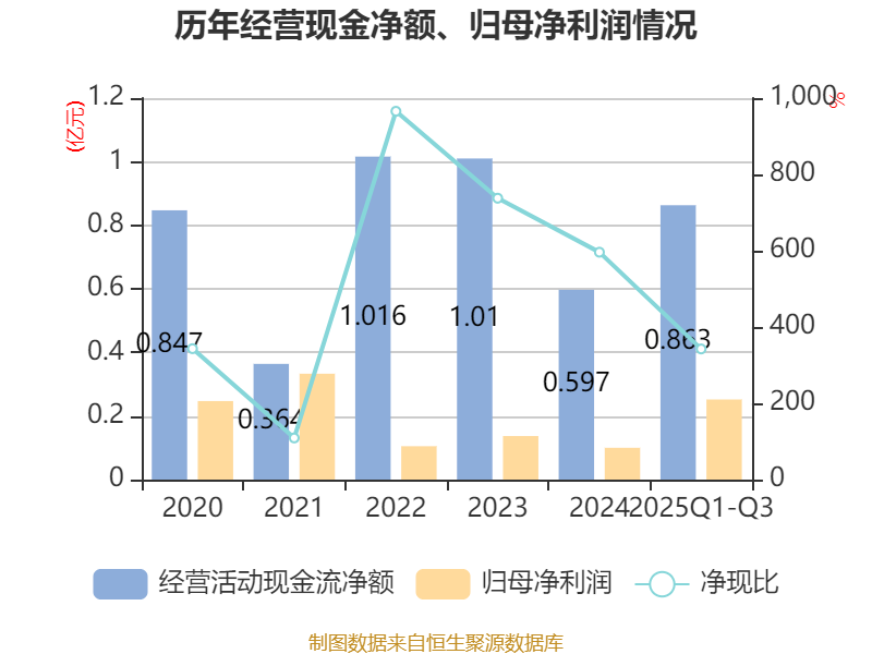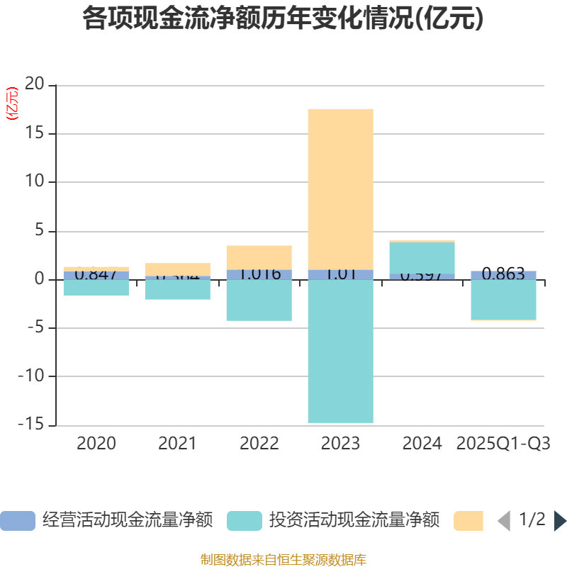 2025年前三季度,公司经营活动现金流净额为8633.61万元,同比增长59.49%;筹资活动现金流净额-985.63万元,同比减少3310.43万元;投资活动现金流净额-4.14亿元,上年同期为3.57亿元。