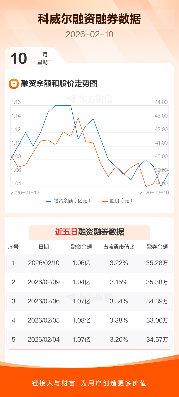 交易所最新数据显示,科威尔于2026年2月10日获融资买入421.05万元,融资偿还242.00万元,当日融资净买入179.05万元。目前,该股融资余额1.06亿,占流通市值比例为3.22%。