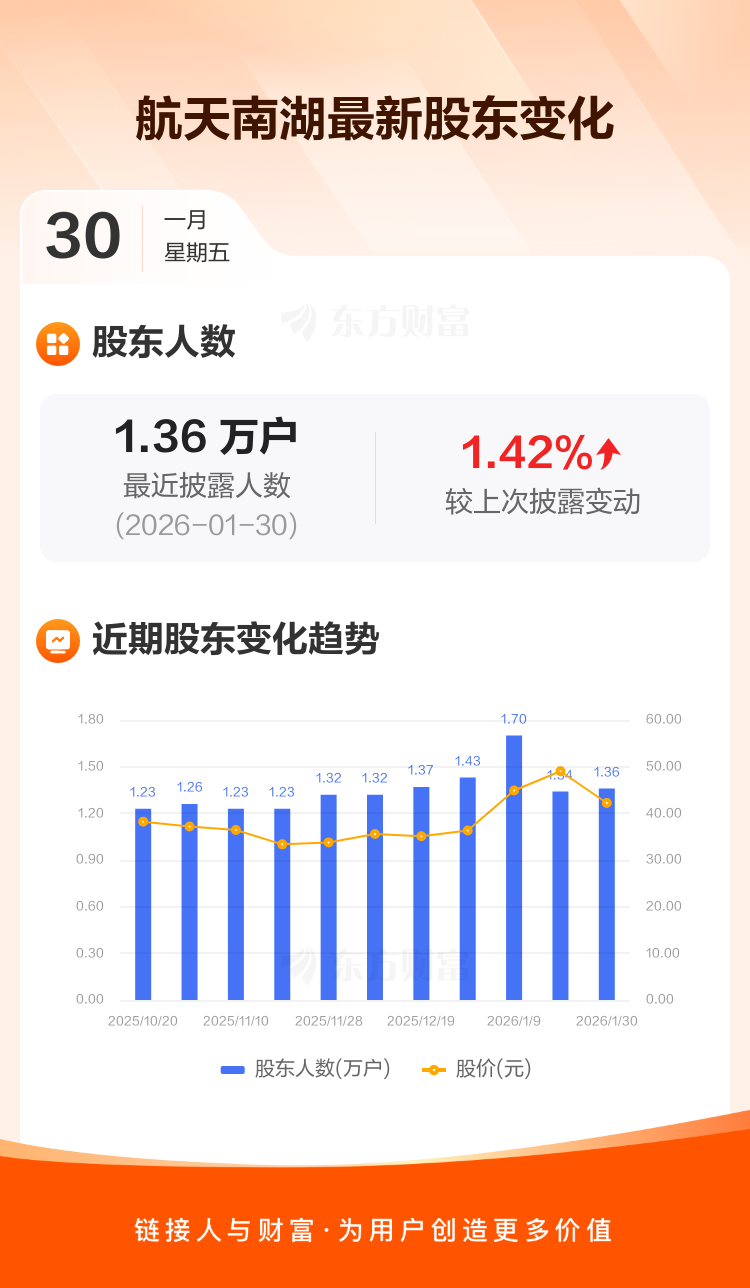航天南湖:截至1月30日最新股东户数1.36万户,较上期增加1.42%