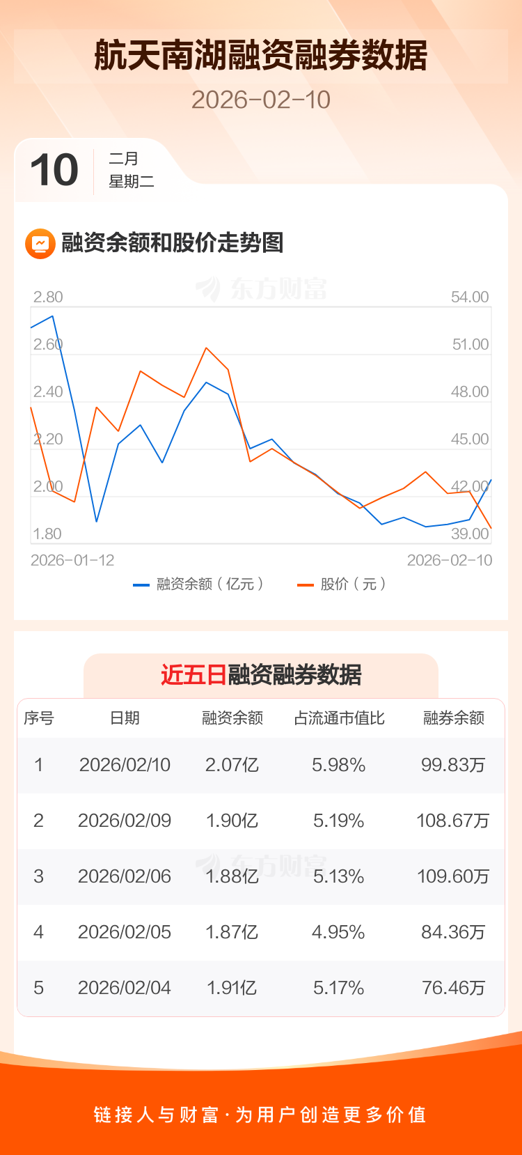 交易所最新数据显示,航天南湖于2026年2月10日获融资买入4324.54万元,融资偿还2635.63万元,当日融资净买入1688.91万元。目前,该股融资余额2.07亿,占流通市值比例为5.98%。