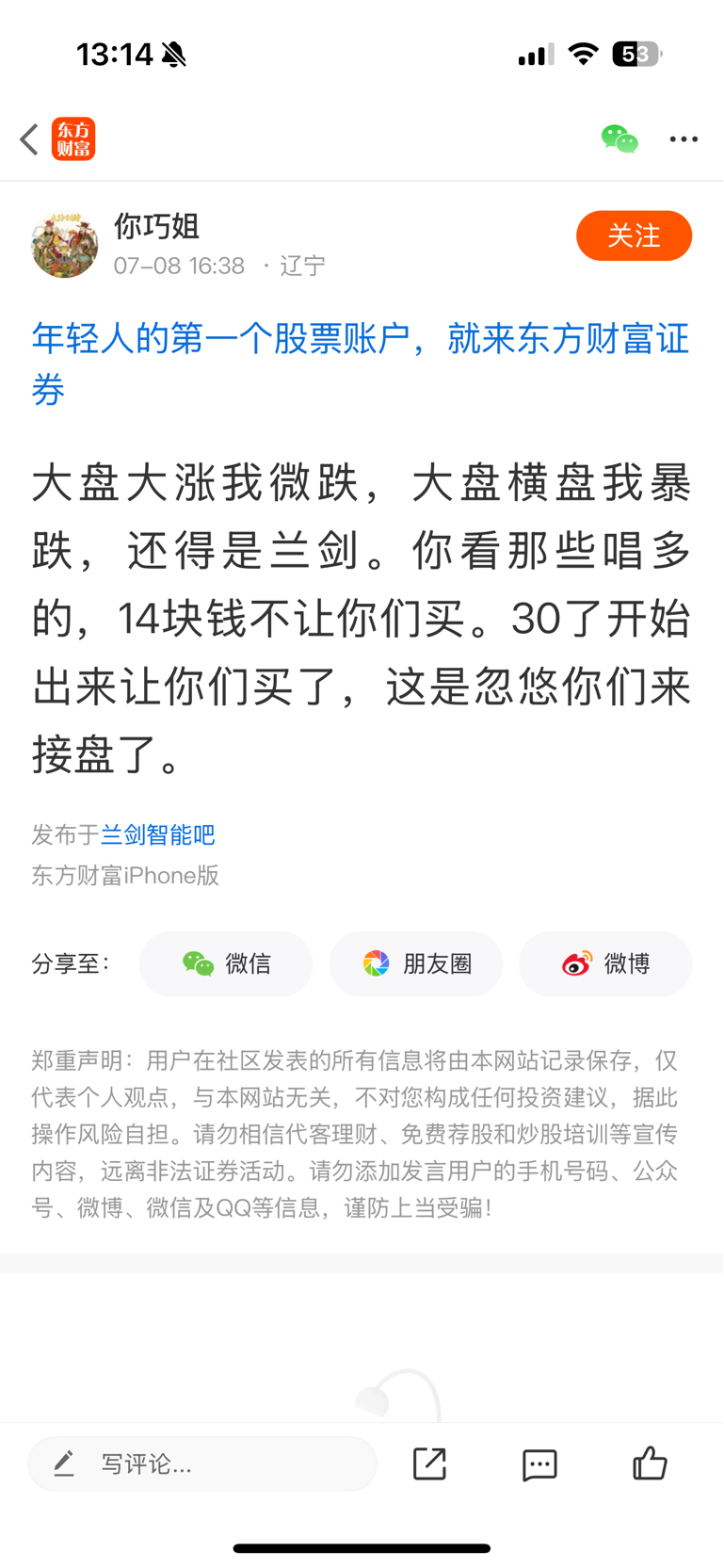温馨提示: 1.根据《证券法》规定,禁止编造、传播虚假信息或者误导性信息,扰乱证券市场;2.用户在本社区发表的所有资料、言论等仅代表个人观点,与本网站立场无关,不对您构成任何投资建议。用户应基于自己的独立判断,自行决定证券投资并承担相应风险。《东方财富社区管理规定》
