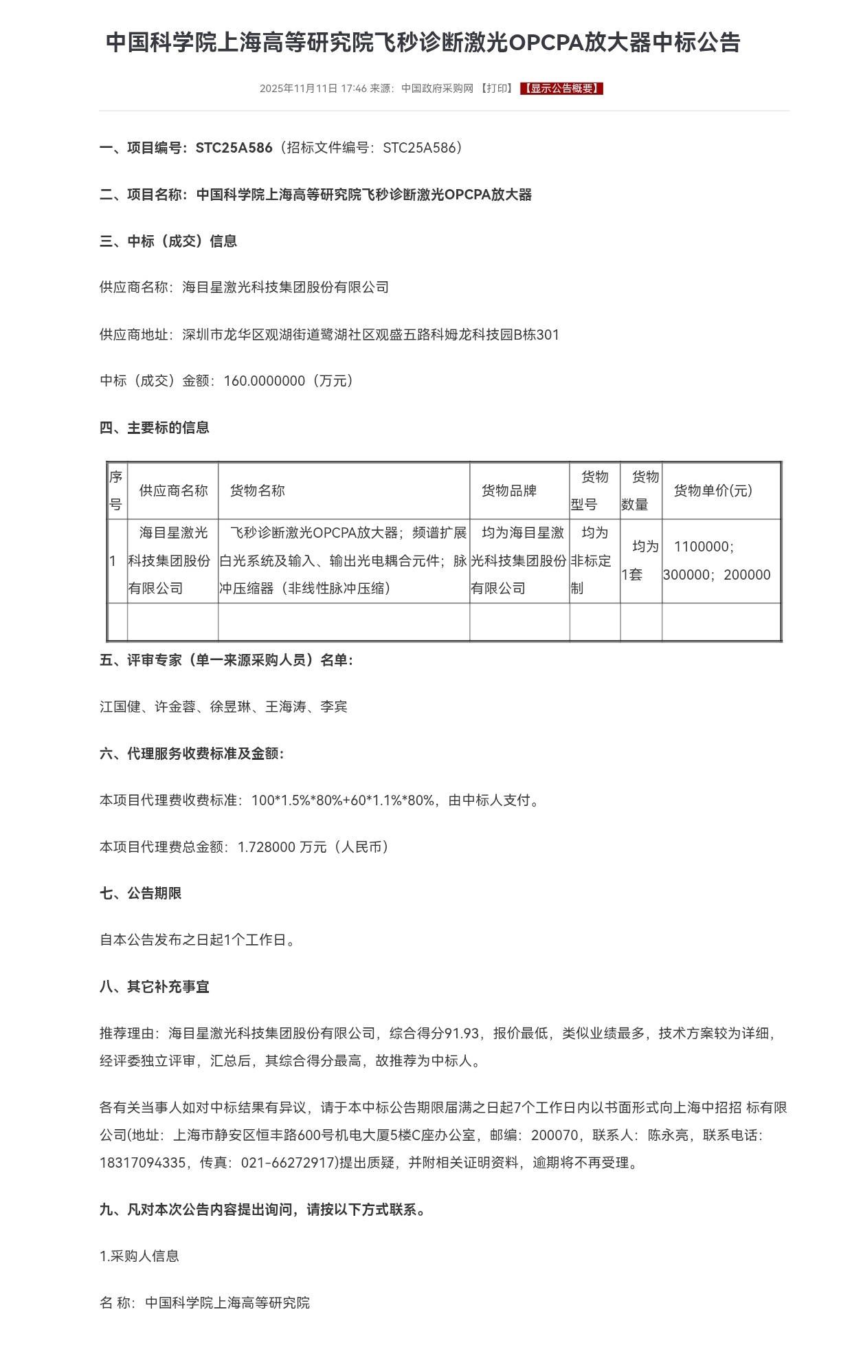 $海目星(SH688559)$ 飞秒诊断激光OPCPA放大器