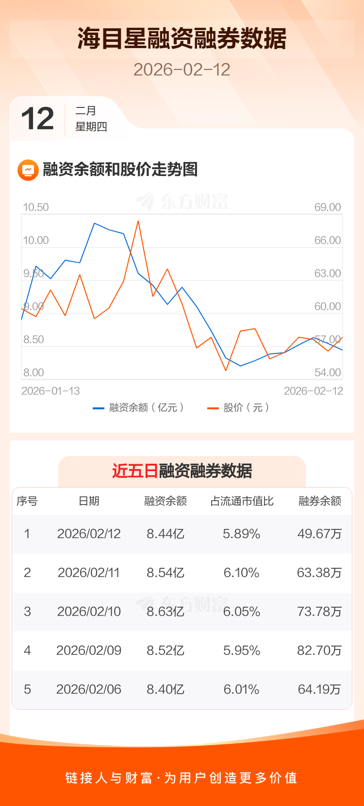 交易所最新数据显示,海目星于2026年2月12日获融资买入2642.71万元,融资偿还3676.12万元,当日融资净偿还1033.41万元。目前,该股融资余额8.44亿,占流通市值比例为5.89%。
