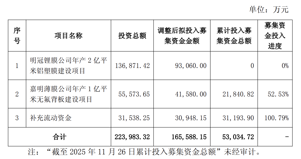 根据公司《明冠新材料股份有限公司2022年度向特定对象发行A股股票募集说明书(注册稿)》披露的募集资金投资项目及募集资金使用计划,截至今年11月26日,“嘉明薄膜公司年产1亿平米无氟背板建设项目”募集资金投入进度为52.53%,“补充流动资金”进度100.79%,而“明冠锂膜公司年产2亿平米铝塑膜建设项目”进度为零。