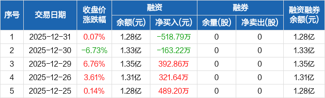 明冠新材:融资净偿还518.79万元,融资余额1.28亿元(12-31)