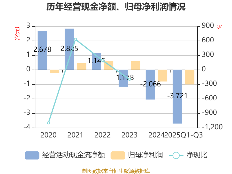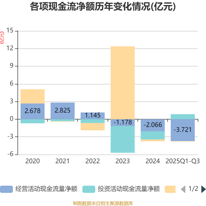 2025年前三季度,公司经营活动现金流净额为-3.72亿元,同比增加7116.24万元;筹资活动现金流净额-664.75万元,同比增加2479.98万元;投资活动现金流净额8565.85万元,上年同期为2.24亿元。