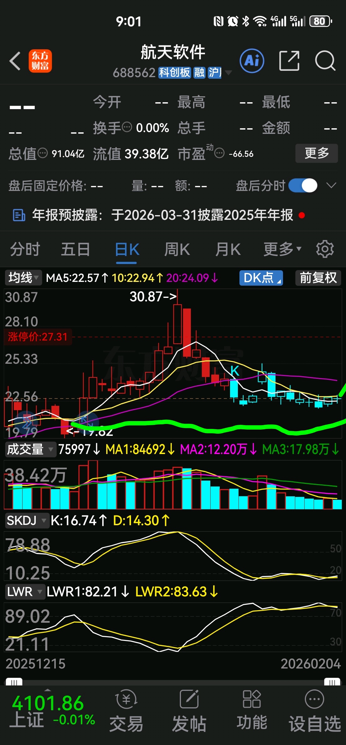 $航天软件(SH688562)$ 航软当下需要一根中阳才能摆脱向下坠落的引力,从量价看有向上的动能,但又受整个行业恐高的影响,很易被行业整体回调(当下热点己经降温)的牵扯,如果有一根5%左右的阳线,必会脱离牵扯走出自己的独立性。不然,将会再下一阶到21左右的密集成交区再次盘整,而等待年报效应的出现。
