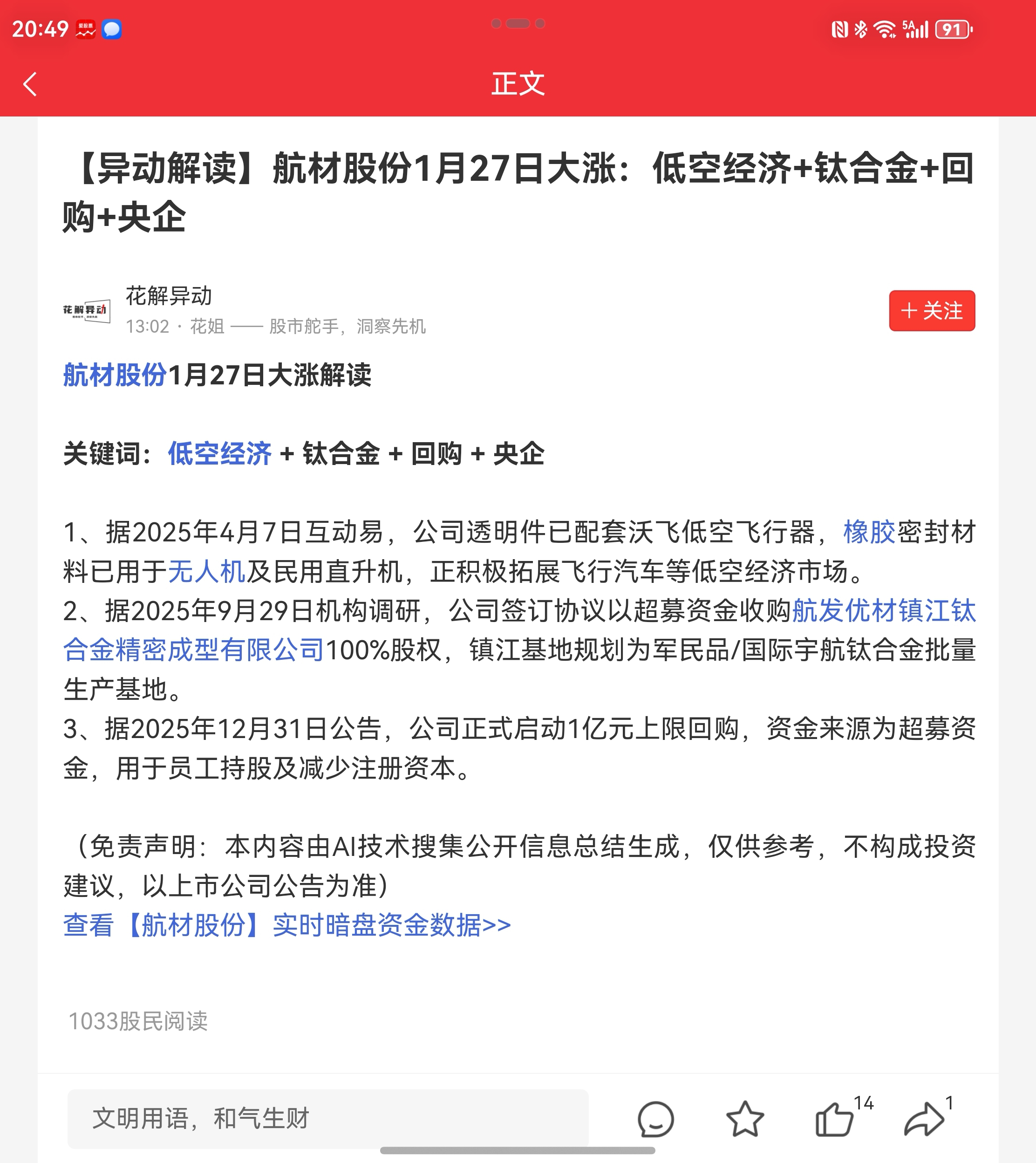航材股份1月27日大涨解读;商业航天+低空经济+钛合金+回购+央企