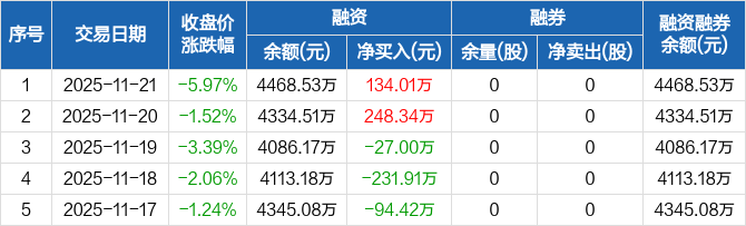 力源科技:融资净买入134.01万元,融资余额4468.53万元(11-21)