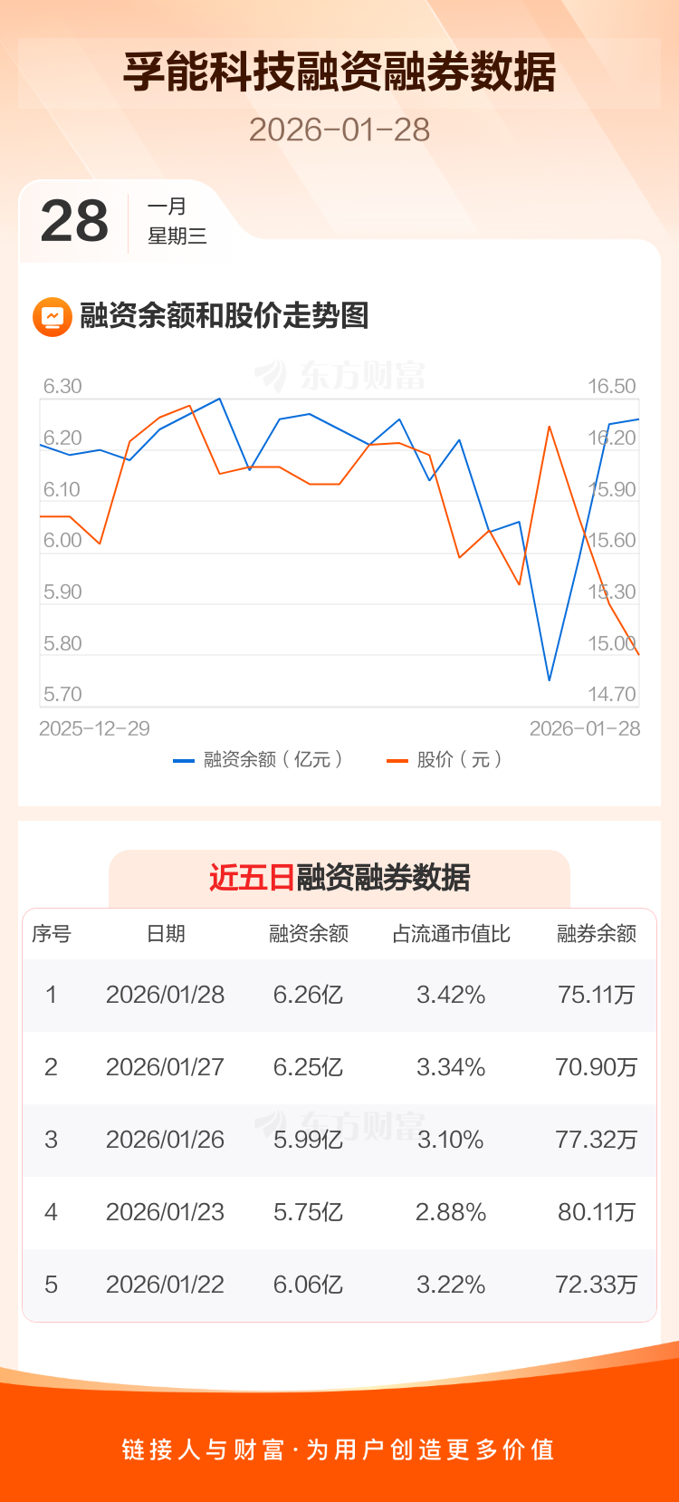 交易所最新数据显示,孚能科技于2026年1月28日获融资买入2708.44万元,融资偿还2568.64万元,当日融资净买入139.79万元。目前,该股融资余额6.26亿,占流通市值比例为3.42%。