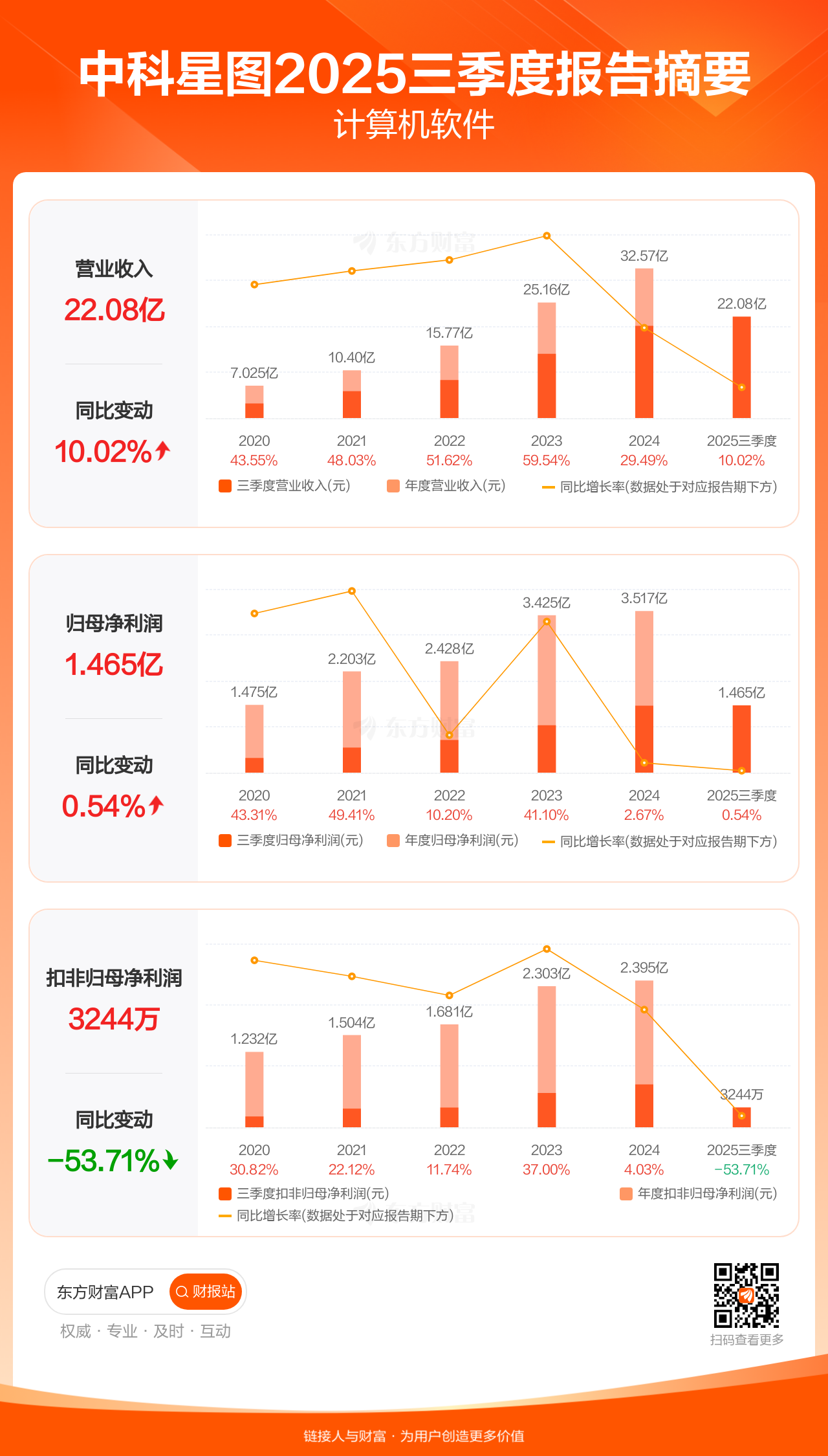 中科星图10月31日发布2025年三季报显示,公司前三季实现营业收入22.08亿元,同比增长10.02%;归母净利润1.46亿元,同比增长0.54%;扣非归母净利润3243.53万元,同比下滑53.71%。