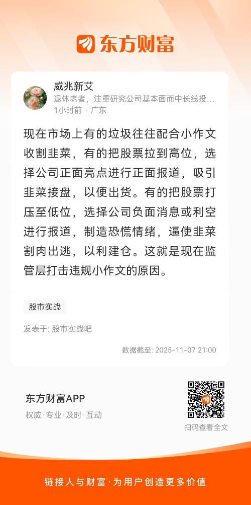 现在市场上有的垃圾往往配合小作文收割韭菜,有的把股票拉到高位,选择公司正面亮点进行正面报道,吸引韭菜接盘,以便出货。有的把股票打压至低位,选择公司负面消息或利空进行报道,制造恐慌情绪,逼使韭菜割肉出逃,以利建仓。这就是现在监管层打击违规小作文的原因。