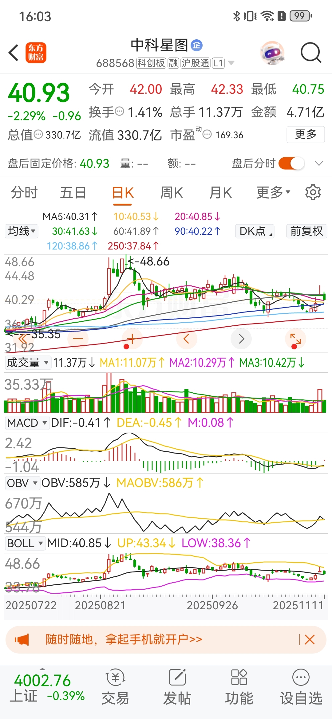 $中科星图(SH688568)$ 昨天的高开是没有想到的高开那么多,从而留下来日线跳空缺口今天的“空头”借大盘及科技股调整而洗盘(我认为是),收市站在20日均价线之上属于强势。k线看还是健康的!(明天再洗洗可以抄底做“T”)