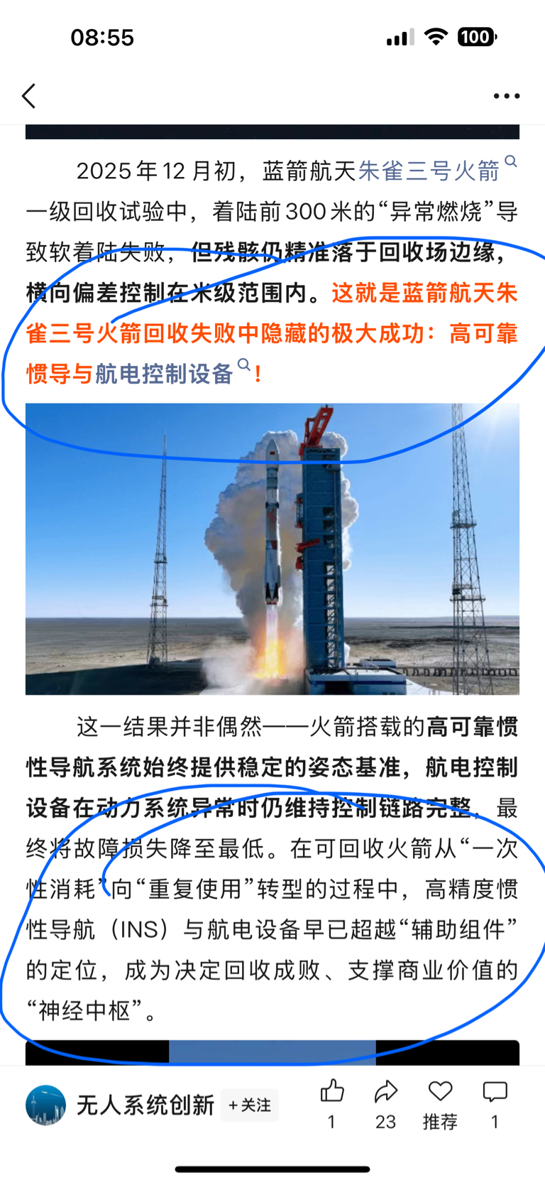 朱雀三的制导和航电测控是成功的,这位博主“无人系统创新”认为虽然朱雀三因为异常燃