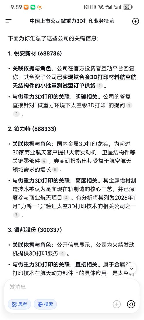 铂力特、华曙高科、银邦股份(飞尔康)。其他3D打印概念可能要大家自己去挖掘。