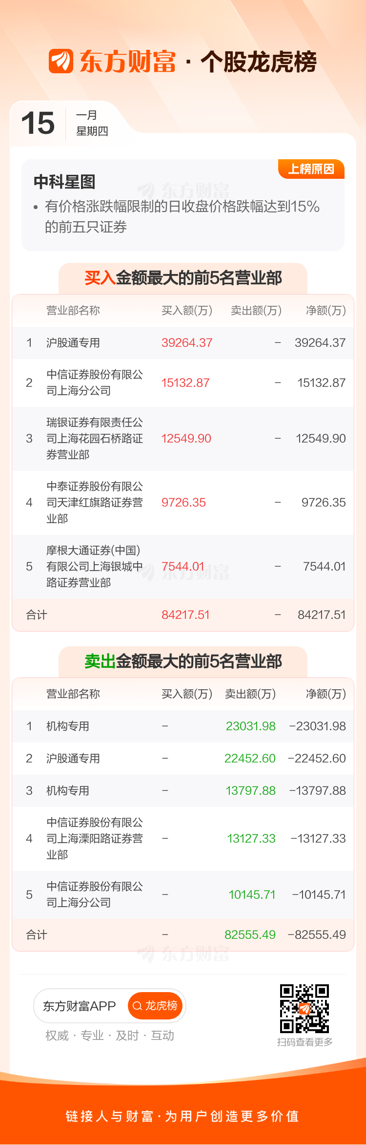 交易所2026年1月15日公布的交易公开信息显示,中科星图因成为有价格涨跌幅限制的日收盘价格跌幅达到15%的前五只证券上榜。中科星图当日收报77.66元,涨跌幅-19.09%,偏离值-19.09%,换手率8.10%,成交额53.21亿。