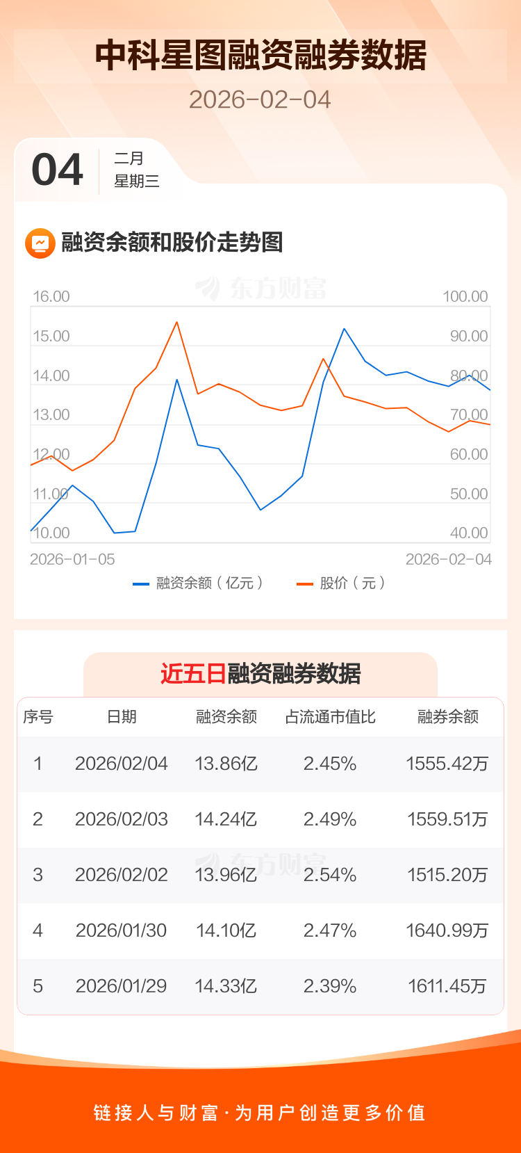 交易所最新数据显示,中科星图于2026年2月4日获融资买入9736.13万元,融资偿还1.35亿元,当日融资净偿还3809.31万元。目前,该股融资余额13.86亿,占流通市值比例为2.45%。