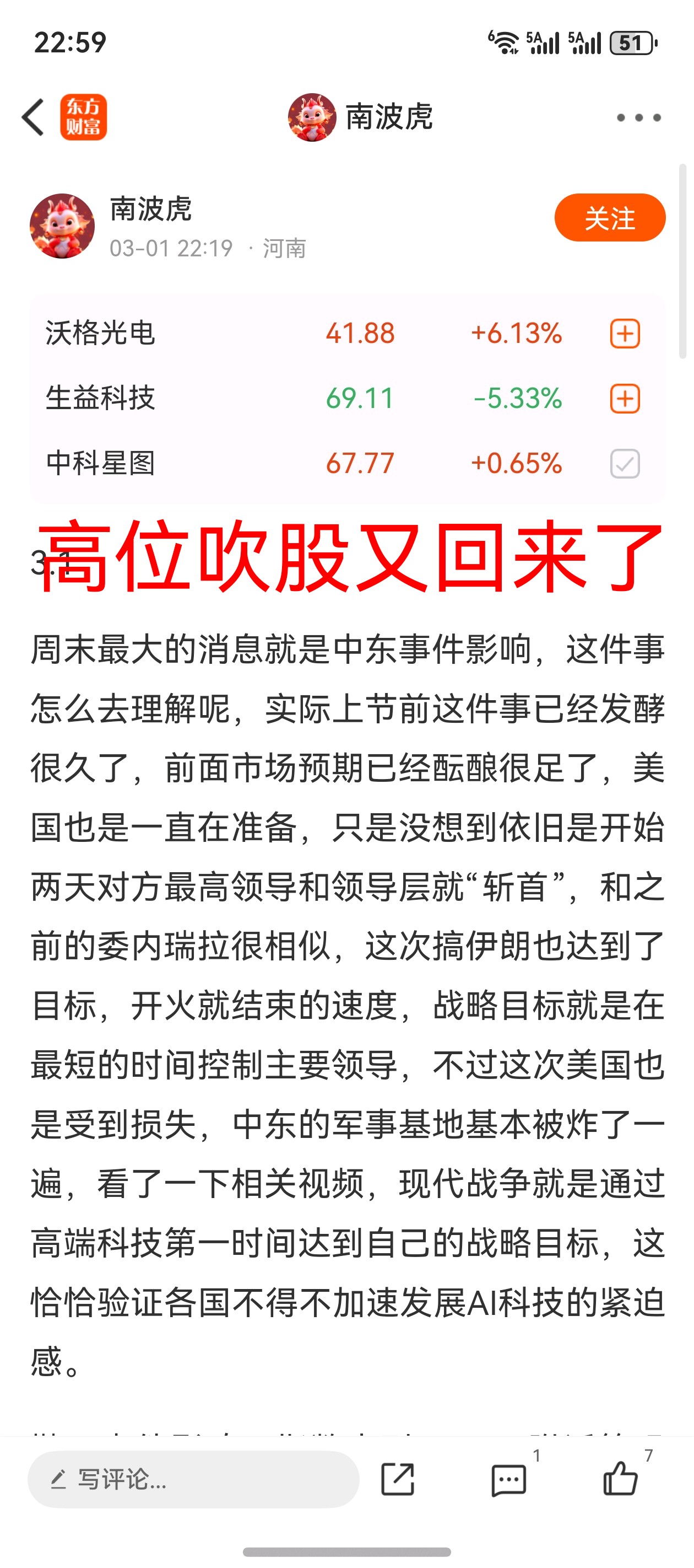 $中科星图(SH688568)$ 善意的提醒一下:美以伊战争不是“黑天鹅”,吧里人气爆棚明天可能是高开,许多的“股吹”又开始了,最后赢家是谁可能谁也不知道。我只想告诉“吧友”头脑勿发热,跟着政策和管理层的目的走的都是赢家!!