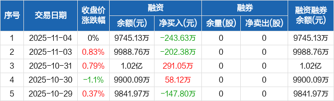 铁科轨道:融资净偿还243.63万元,融资余额9745.13万元(11-04)