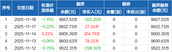 铁科轨道:融资净偿还265.2万元,融资余额9667.53万元(11-18)