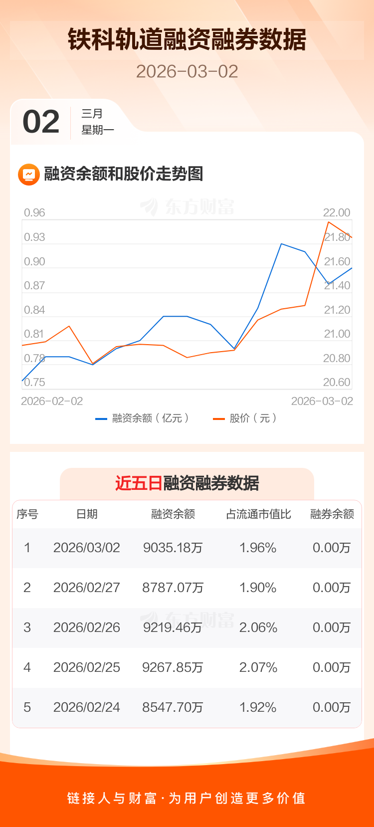 交易所最新数据显示,铁科轨道于2026年3月2日获融资买入858.44万元,融资偿还610.33万元,当日融资净买入248.11万元。目前,该股融资余额9035.18万,占流通市值比例为1.96%。