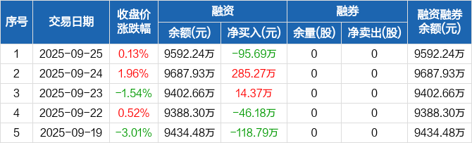 杭华股份:融资净偿还95.69万元,融资余额9592.24万元(09-25)