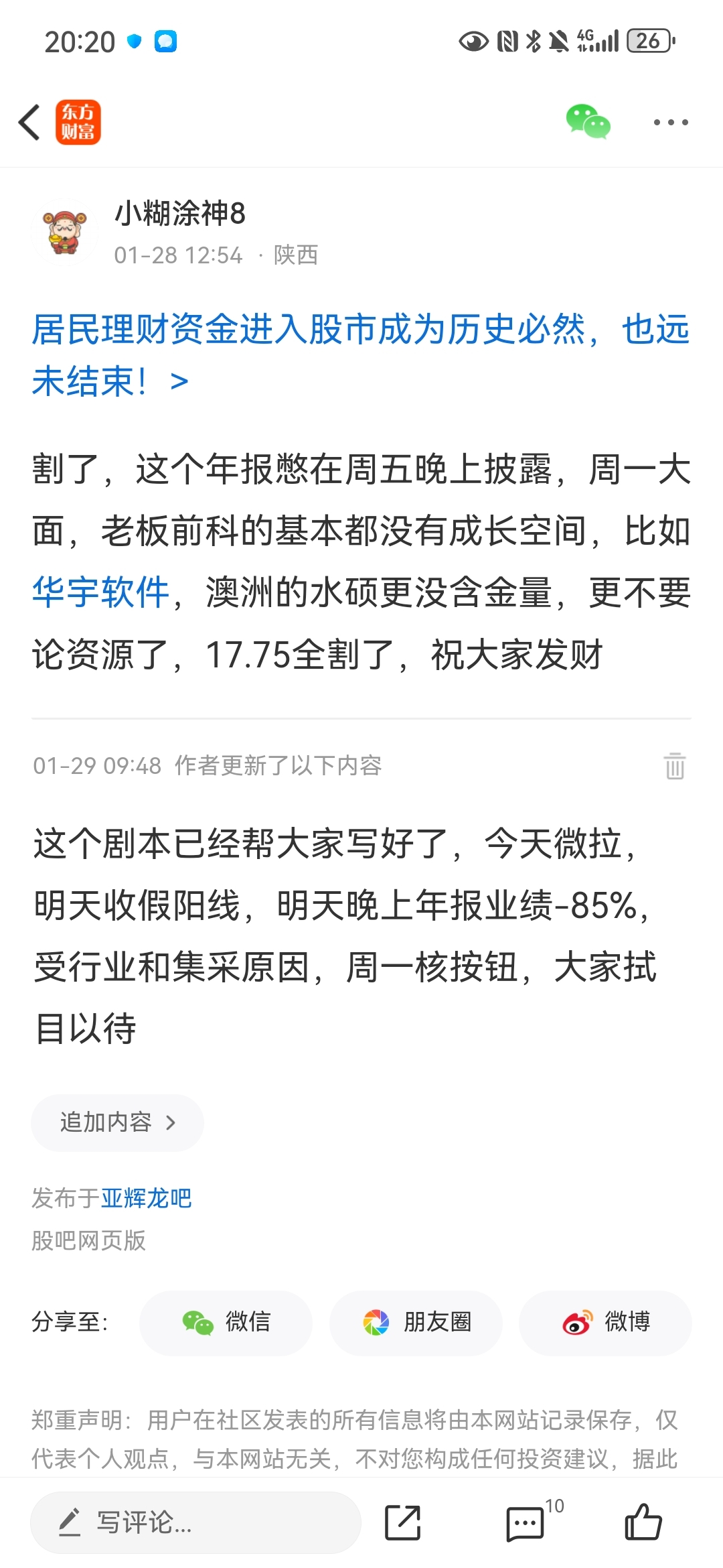 温馨提示: 1.根据《证券法》规定,禁止编造、传播虚假信息或者误导性信息,扰乱证券市场;2.用户在本社区发表的所有资料、言论等仅代表个人观点,与本网站立场无关,不对您构成任何投资建议。用户应基于自己的独立判断,自行决定证券投资并承担相应风险。《东方财富社区管理规定》