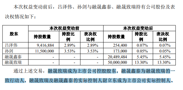 通过上述交易,融晟致瑞成为公司控股股东,融晟鑫泰为融晟致瑞的一致行动人,融晟致瑞及融晟鑫泰的实际控制人尉立东成为公司实际控制人。公司股票已于1月16日开市起复牌。