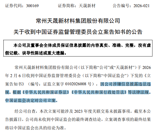 2月6日晚间,天晟新材公告称,收到证监会下发的《立案告知书》,因涉嫌信息披露违法违规,证监会决定对公司立案。
