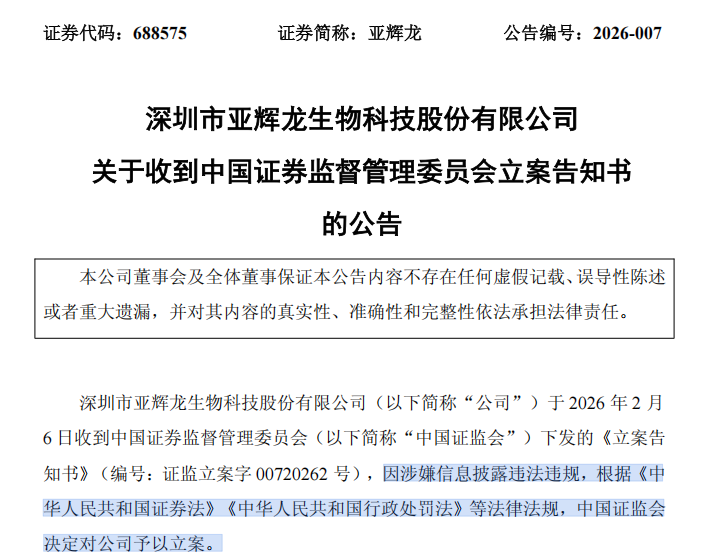 2月6日晚间,亚辉龙公告称,收到证监会下发的《立案告知书》,因涉嫌信息披露违法违规,证监会决定对公司立案。