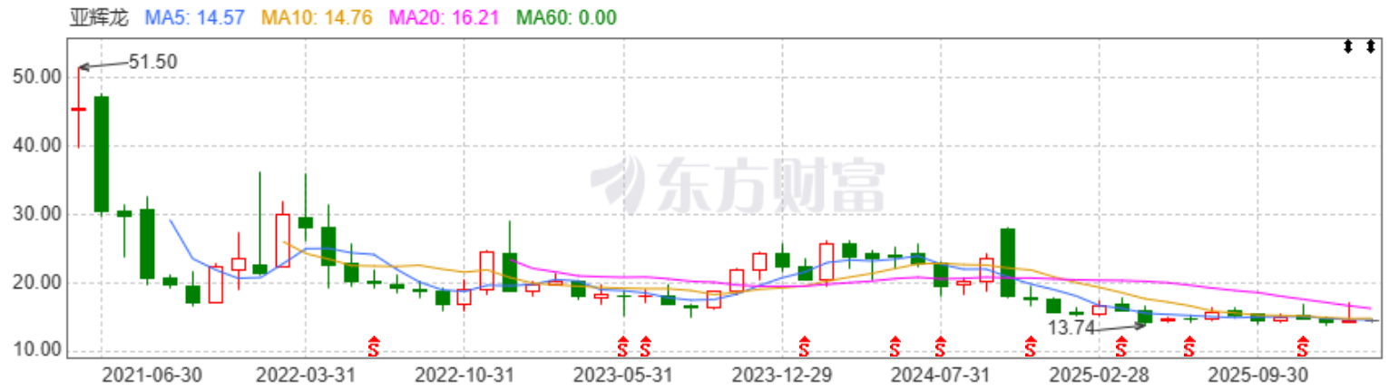 二级市场上,亚辉龙上市即巅峰,在上市初创下逾50元的高点后股价节节走低,截至2月6日收盘,亚辉龙报14.45元/股,公司总市值82.57亿元。