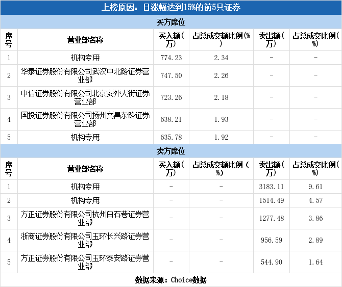 多主力现身龙虎榜,浙海德曼上涨15.22%(02-18)