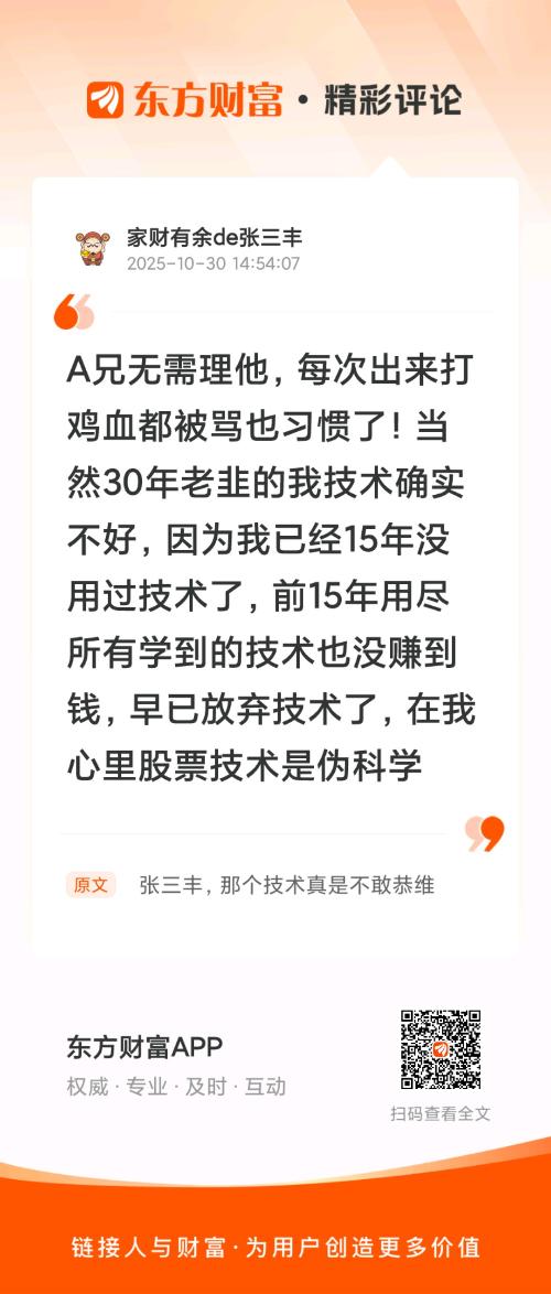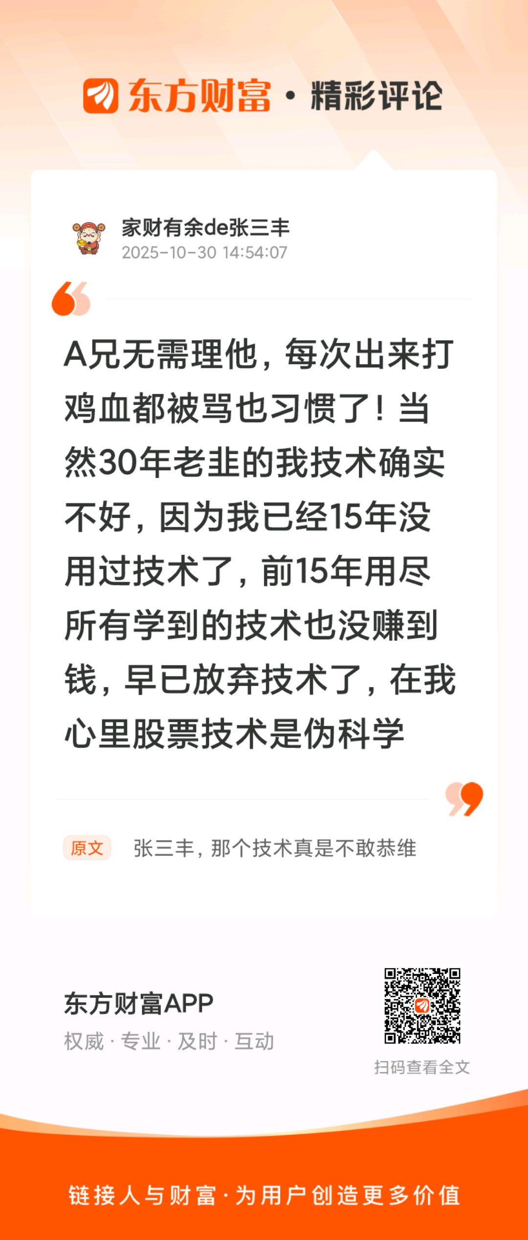//@家财有余de张三丰 :A兄无需理他,每次出来打鸡血都被骂也习惯了!当然30年老韭的我技术确实不好,因为我已经15年没用过技术了,前15年用尽所有学到的技术也没赚到钱,早已放弃技术了,在我心里股票技术是伪科学