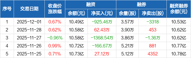 融资方面,当日融资买入1176.35万元,融资偿还2101.82万元,融资净偿还925.46万元。融券方面,融券卖出0股,融券偿还3318股,融券余量3.57万股,融券余额353.2万元。融资融券余额合计10.53亿元。