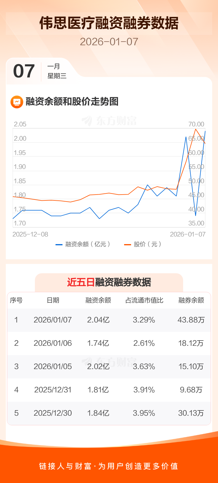 交易所最新数据显示,伟思医疗于2026年1月7日获融资买入1.08亿元,融资偿还7892.38万元,当日融资净买入2906.79万元。目前,该股融资余额2.04亿,占流通市值比例为3.29%。