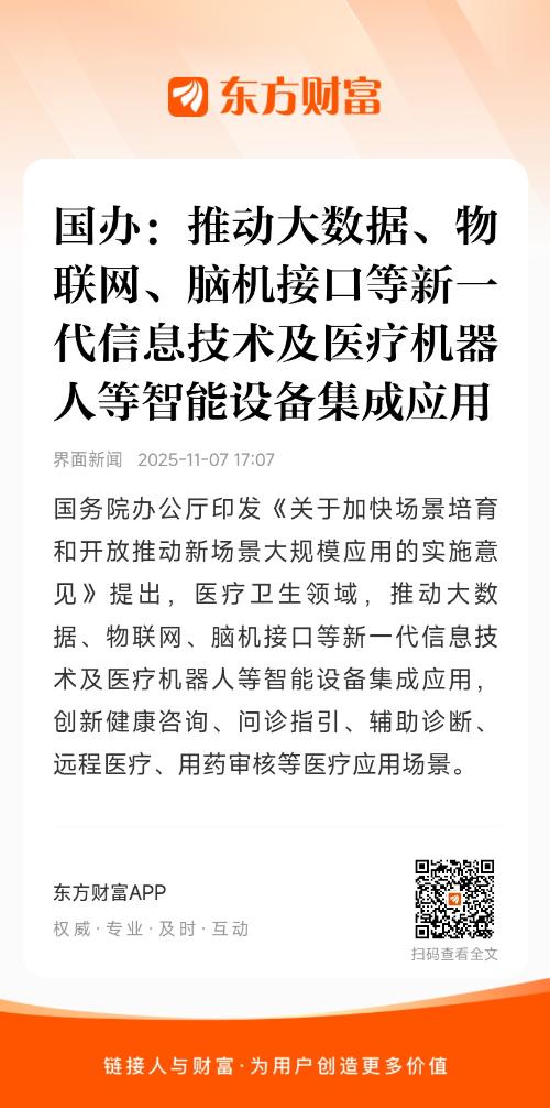 国务院办公厅印发《关于加快场景培育和开放推动新场景大规模应用的实施意见》提出,医疗卫生领域,推动大数据、物联网、脑机接口等新一代信息技术及医疗机器人等智能设备集成应用,创新健康咨询、问诊指引、辅助诊断、远程医疗、用药审核等医疗应用场景。