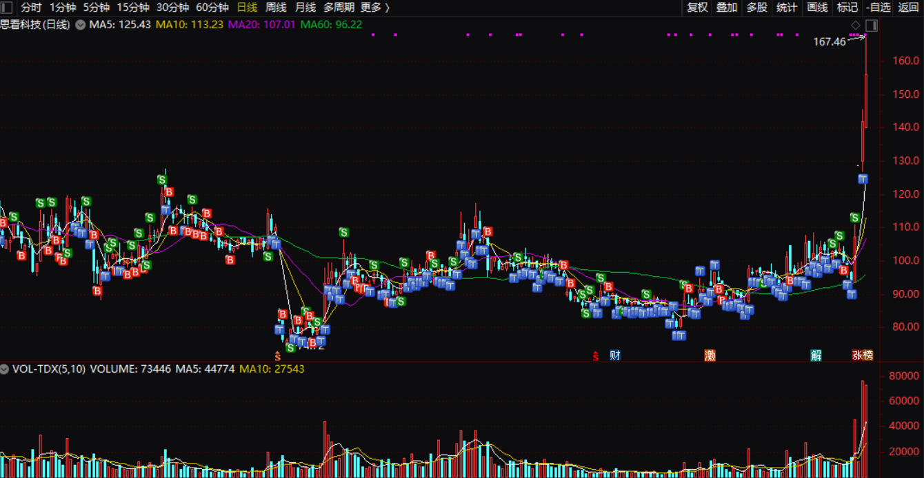 持有思看科技快一年了,不断的T,不喜欢大涨不怕大跌。单最近4天的疯狂已经无正常T可做,还是清仓让给疯狂的跟风者吧!1-2天必有大跌再接回吧!大家加油疯,哈哈!